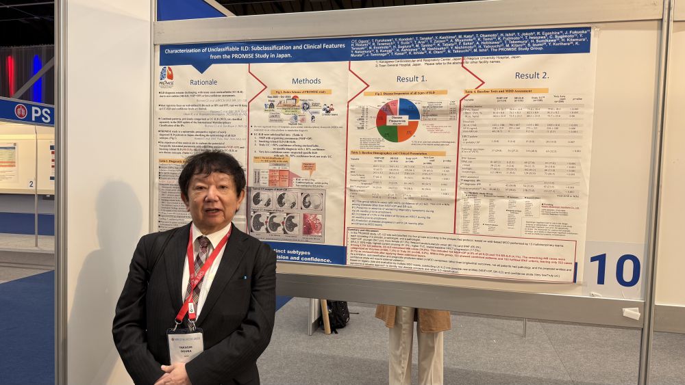 私たちの研究グループから、小倉髙志 先生(神奈川県立循環器呼吸器病センター)が、PROMISE試験の中間解析結果のうち分類不能型ILDに関して報告しました。
